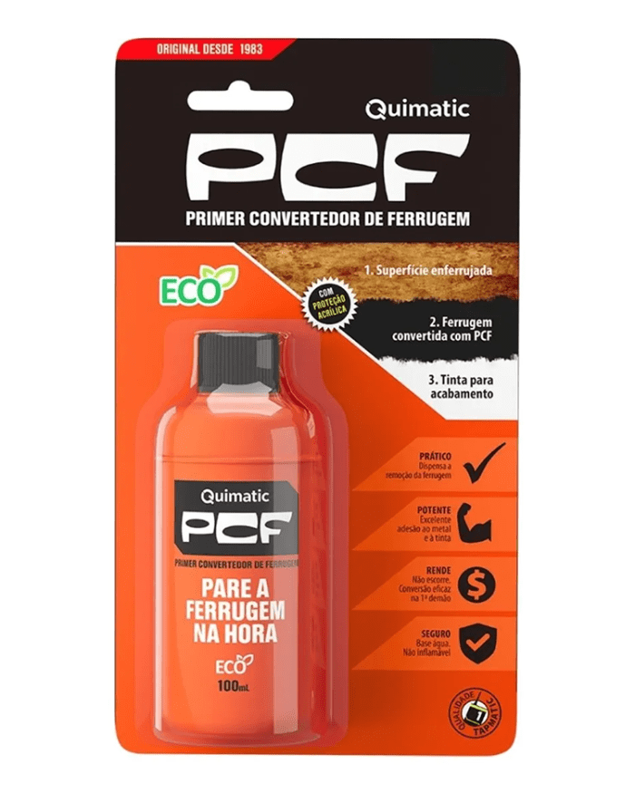 Afinal, estamos falando de remoção da ferrugem com lixamento ou jateamento, contratação de mão de obra especializada, aplicação de primer como fundo e, depois, pintura. Mas há uma alternativa bem mais prática e rápida para o tratamento antiferrugem de superfícies: o uso de convertedor de ferrugem, como é o caso do PCF, da Quimatic Tapmatic, ideal para aplicação sobre ferro, ferro fundido e aço.